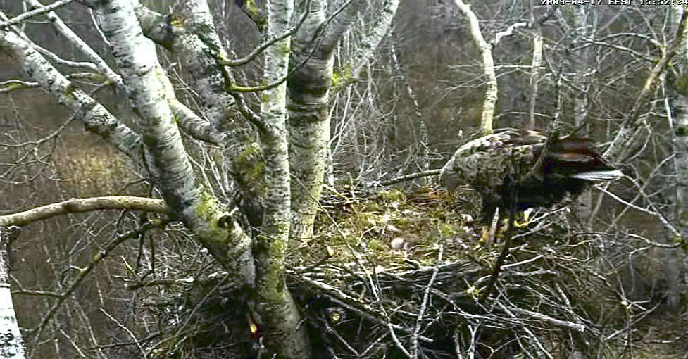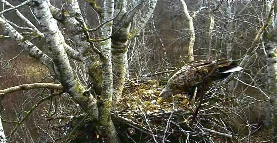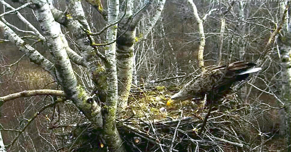 Предположения наблюдателей подтвердились! Первый птенец орлана-белохвоста вылупился вчера 16 апреля. И вот вам, пожалуйста: только что папаша Сулев принес какую-то птичку, и Линда кормит своего отпрыска.